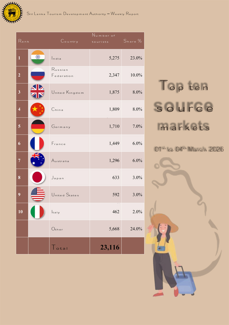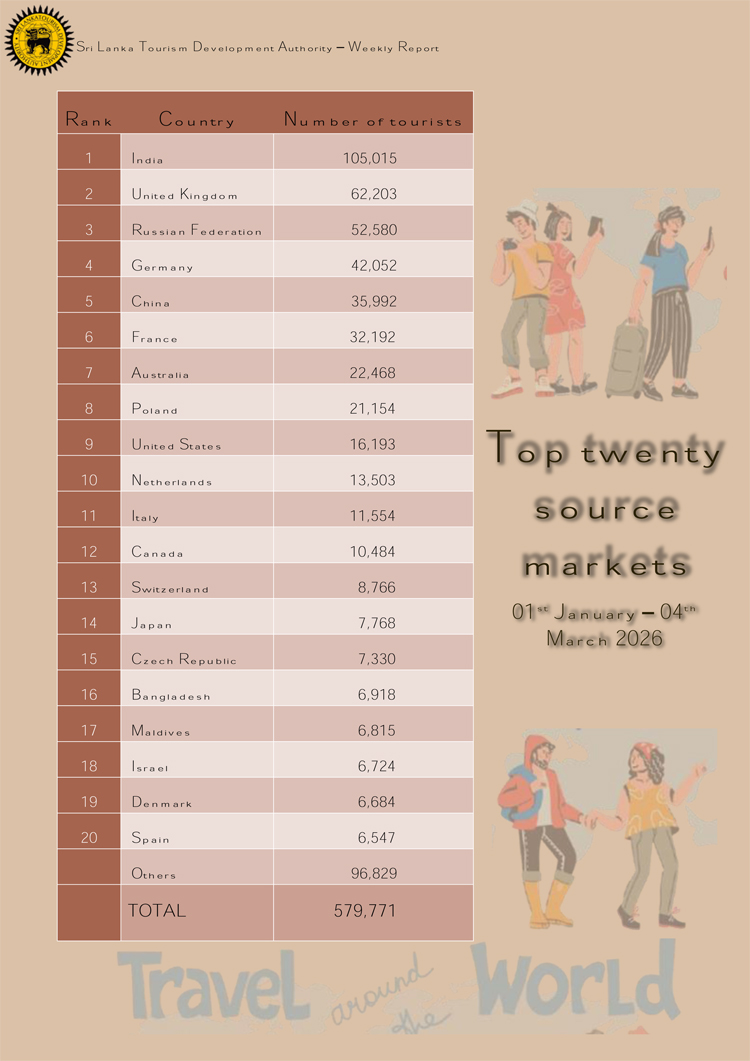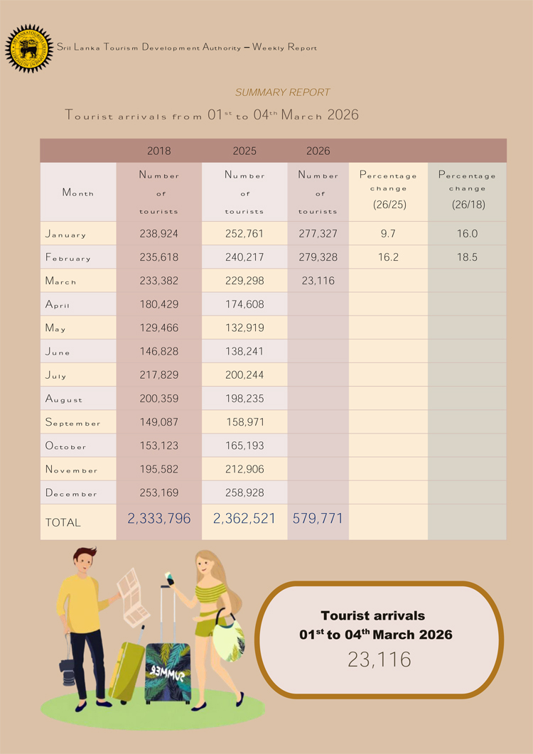 2026 වසරේ මුල් මාස දෙක තුළ සීඝ්ර වර්ධනයක් පෙන්නුම් කරන ලද සංචාරක කර්මාන්තයේ යම් පසුබැස්මක් මාර්තු මාසයේ මුල් දින කිහිපය තුළ වාර්තා වේ.