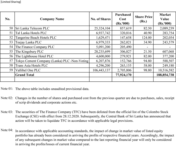 අදාළ දත්ත වාර්තා සන්සන්දනයේ දී පෙනී යන්නේ අරමුදල විසින් පහත සඳහන් සමාගම්වල කොටස් ආයෝජනයන්ගෙන් ඉවත් වී ඇති බවයි. එනම්,