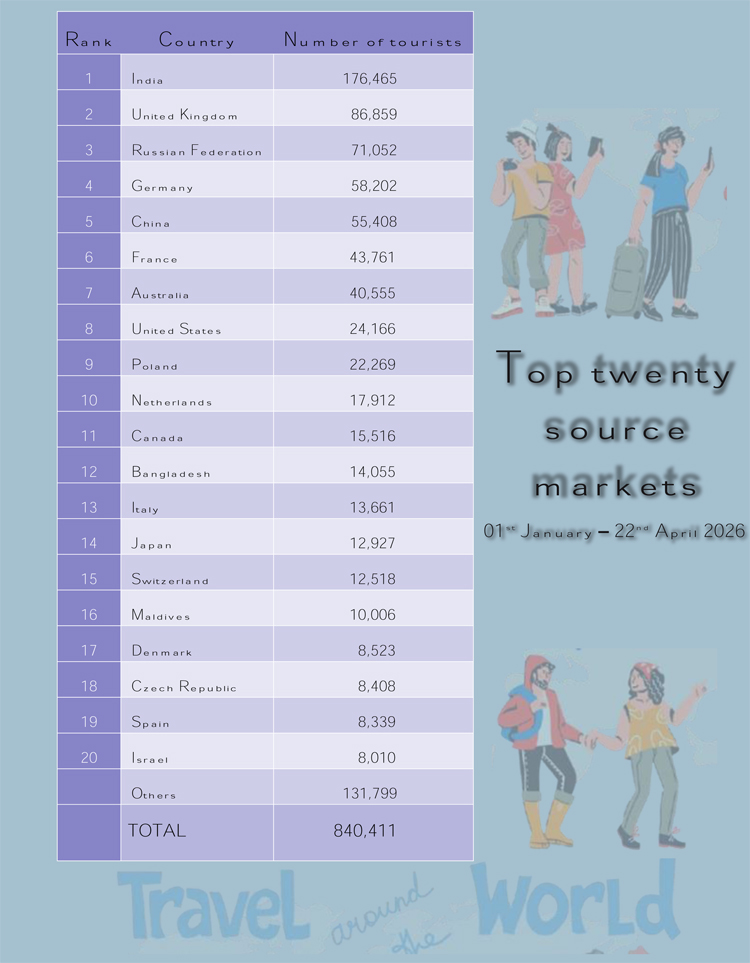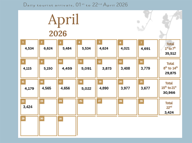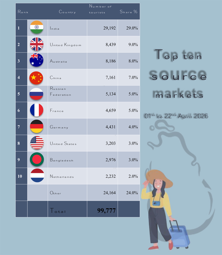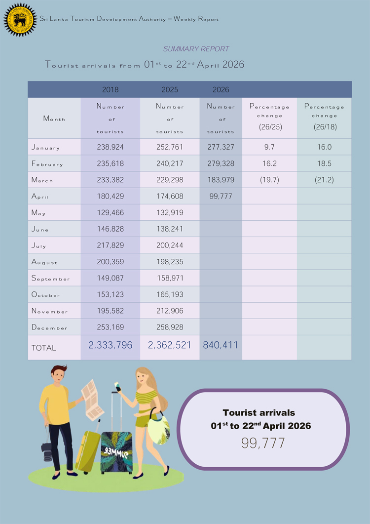 මේ අතර සංචාරක සංවර්ධන අධිකාරිය විසින් නිකුත් කරන ලද නවතම වාර්තාවක සඳහන් වන්නේ 2026 අප්රේල් මාසයේ මුල් දින 22 තුළ දී 99,777ක සංචාරකයින් පිරිසක් මෙරටට පැමිණ ඇති බවයි. එයින් 29%ක්ම ඉන්දියානු සංචාරකයින් වන අතර එම ප්රමාණය 29,192ක් ලෙසින් වාර්තා වී ඇත.