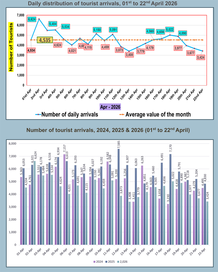 මැදපෙරදිග යුද අර්බුදයත් සමඟ ගෝලීය සංචාරක කර්මාන්තය පසුගිය මාර්තු මාසයේ ආරම්භයේ සිට මන්දගාමී වූ අතර එහි බලපෑම ශ්රී ලංකාවට ද මේ වන විට දැඩිව එල්ල වෙමින් තිබේ. එහි ප්රතිඵලයක් ලෙසින් දෛනික සංචාරක පැමිණීමේ සාමාන්ය 2026 අප්රේල් මාසය තුළ දී 4,535ක් දක්වා පහළ බැස ඇත. මෙම අගය 2026 ජනවාරි – 8,946ක්, පෙබරවාරි – 9,976ක් සහ මාර්තු – 5,934ක් ලෙසින් වාර්තා වී තිබුණි. ඒ අනුව 2026 ජනවාරි මාසය හා සැසඳීමේ දී 2026 අප්රේල් මාසයේ දී දෛනික සංචාරක පැමිණීම 50%කින් පහළ ගොස් ඇත.